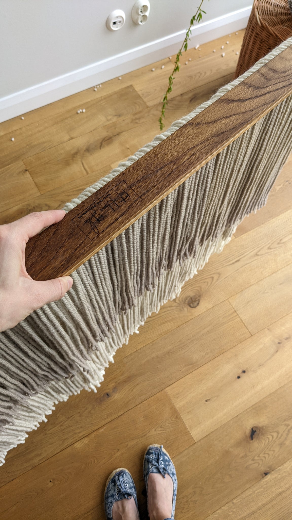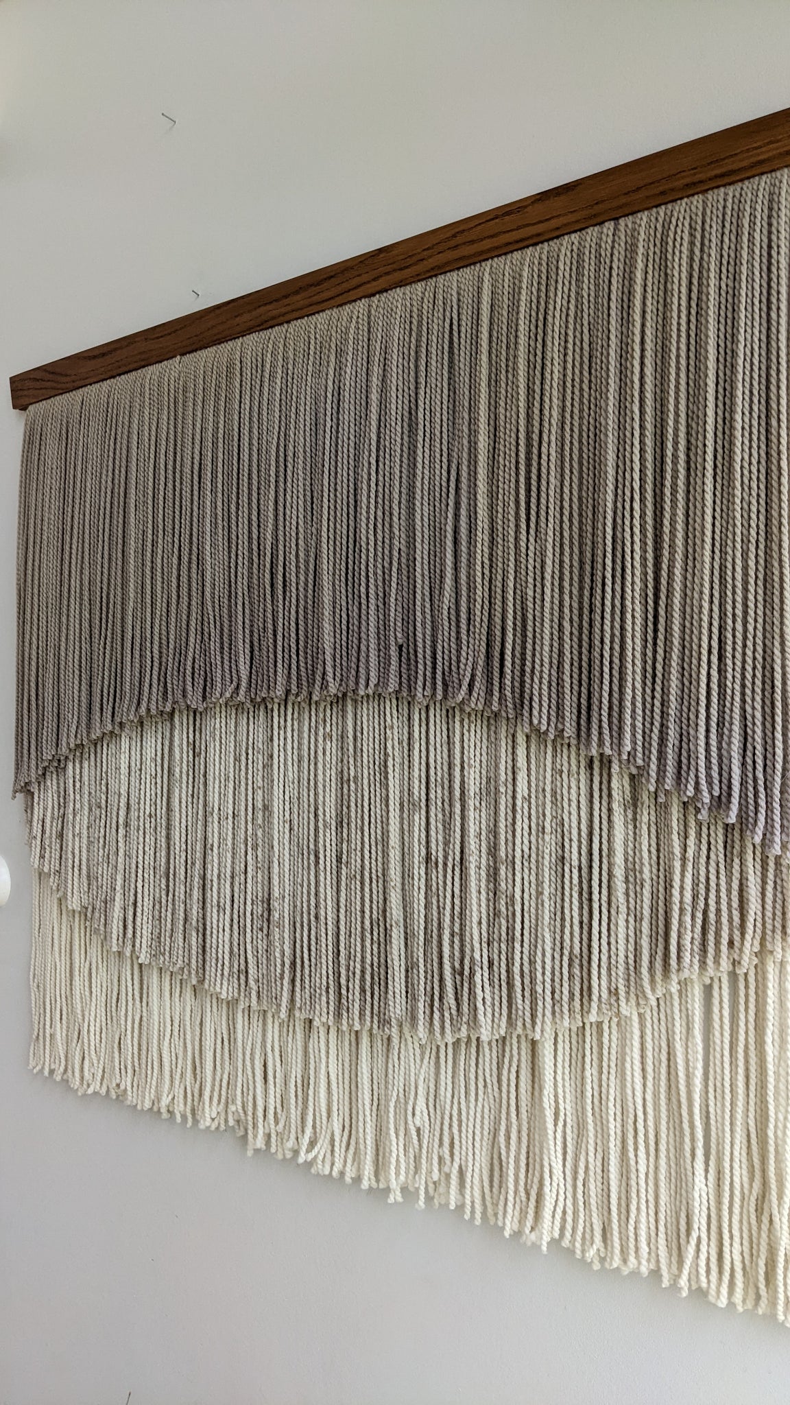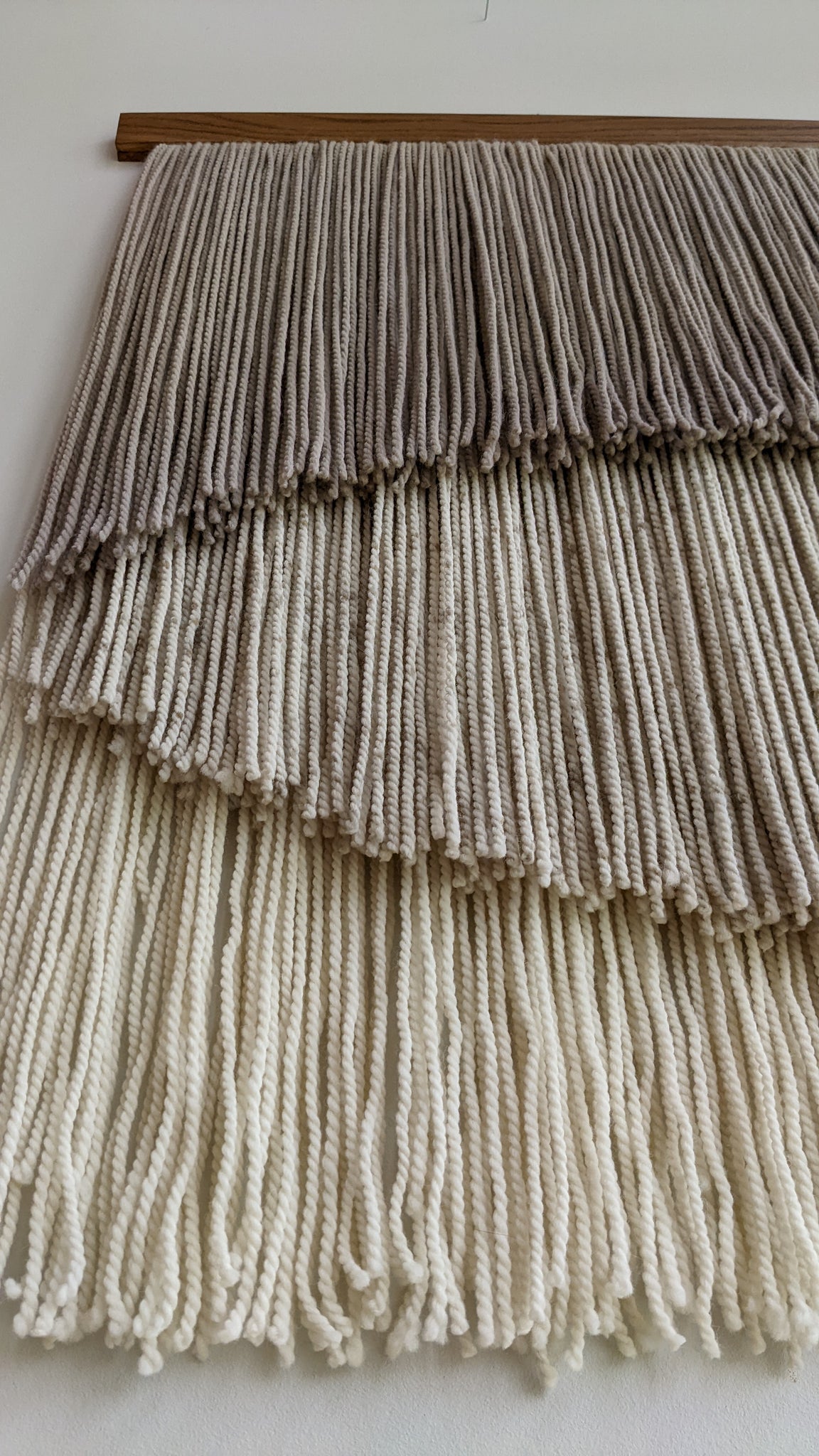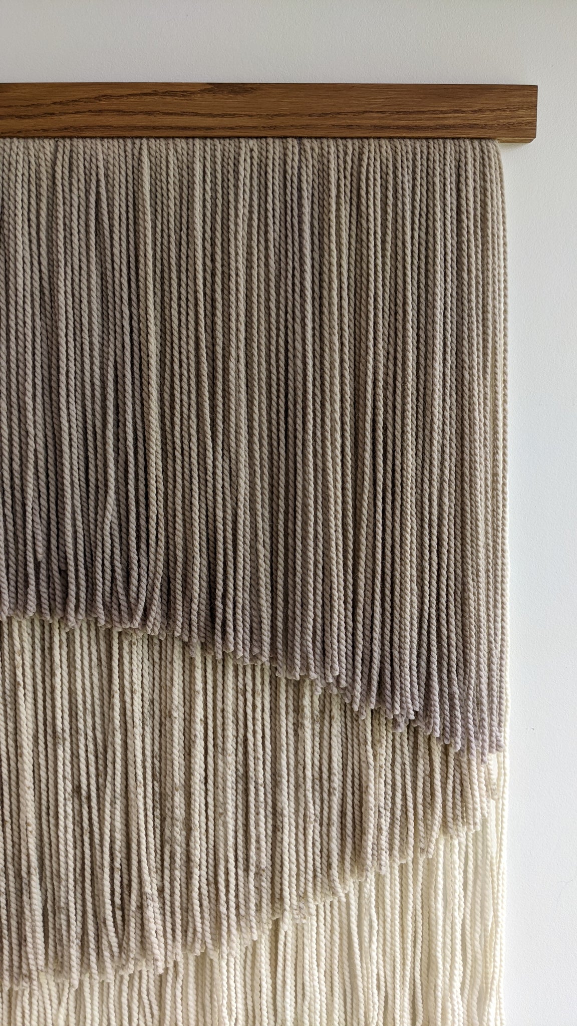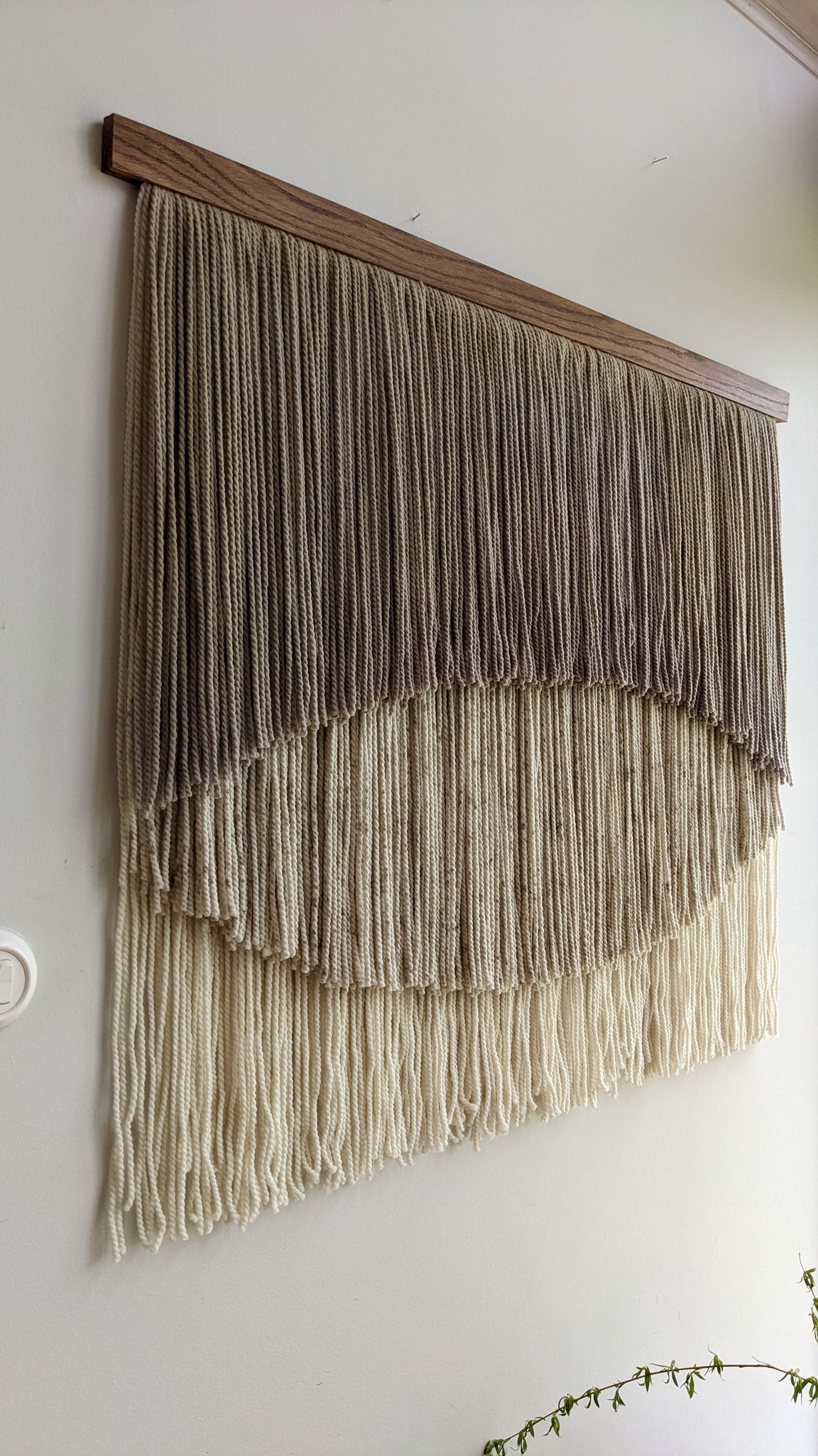This minimal dip dyed wall hanging is made of soft wool, in shades of beige/bronze and brown finished with a bronze stained oak wood panel. Fiber art like this will suit perfectly a minimal living room, modern bedroom, and mid-century office.